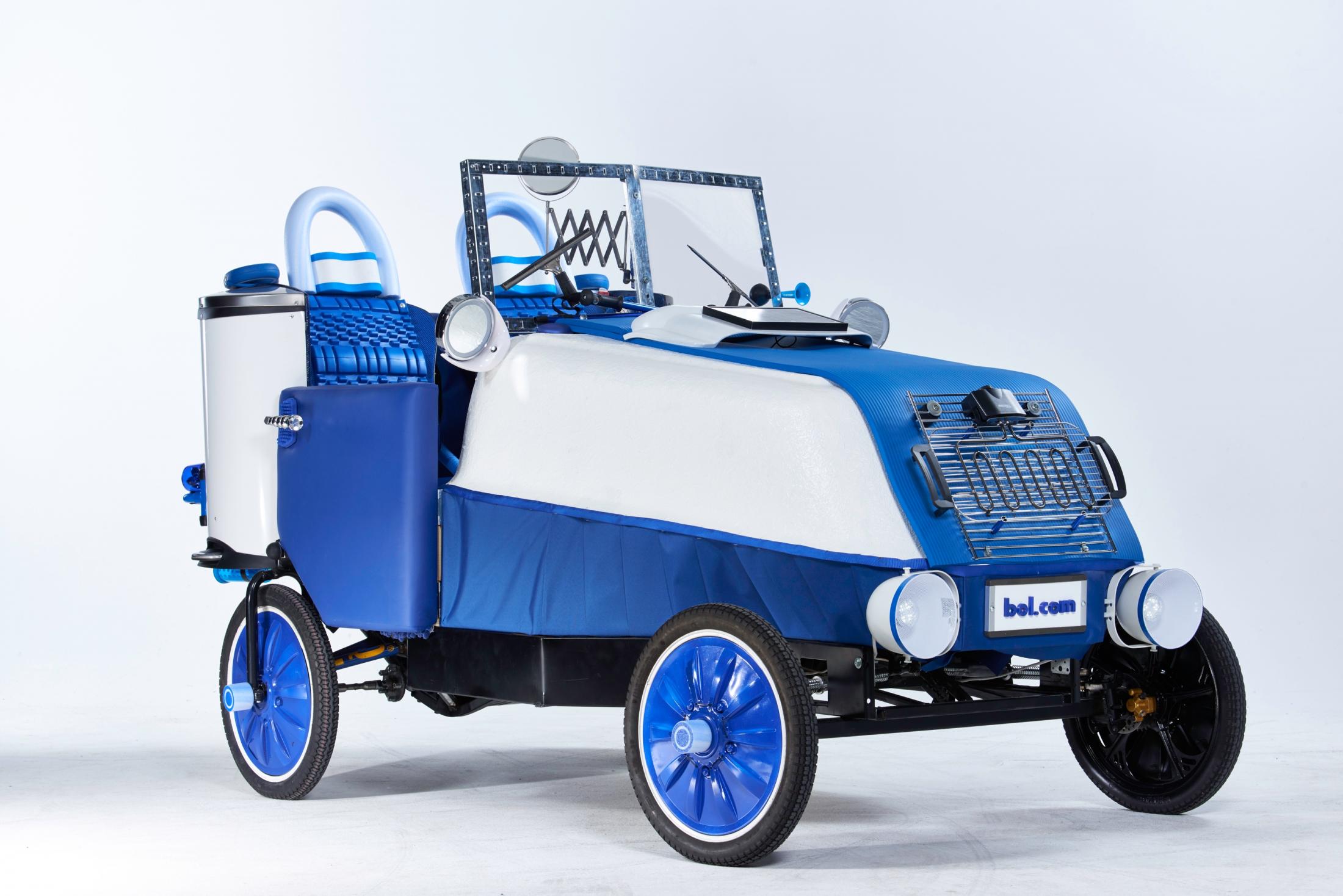 Dit missende product maakten we van artikelen die bol.com wél heeft. Dit resulteerde in de enige echte bol.com Winkelwagen: een werkende auto gemaakt van 223 producten. (Waaronder een grillplaat, spatels en twee buttplugs.)